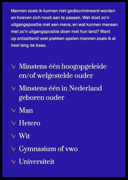 Zelfs Joris Luyendijk (die het boek 'De 7 vinkjes' schreef) ging even (met enige zelfoverschatting, alhoewel ik ook wel de indruk heb dat hij zijn privileges vanuit oprecht inzicht is gaan inzien, wat juist mooi is) uitleggen aan de wereld 'dat ongelijkheid door 7 factoren bepaald word' (afkomst, gender, geaardheid, opleiding, universiteit, en minimaal één ouder die welgesteld of in NL geboren is) en dan ook nog denken 'dat je het wiel uitgevonden hebt' terwijl er bestaan nog veel, veel meer vlakken die van invloed zijn. Niet slechts 7.